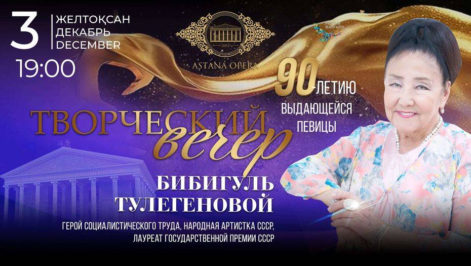 В столице пройдёт творческий вечер к 90-летию Бибигуль Тулегеновой, сообщает сайт театра "Астана Опера".