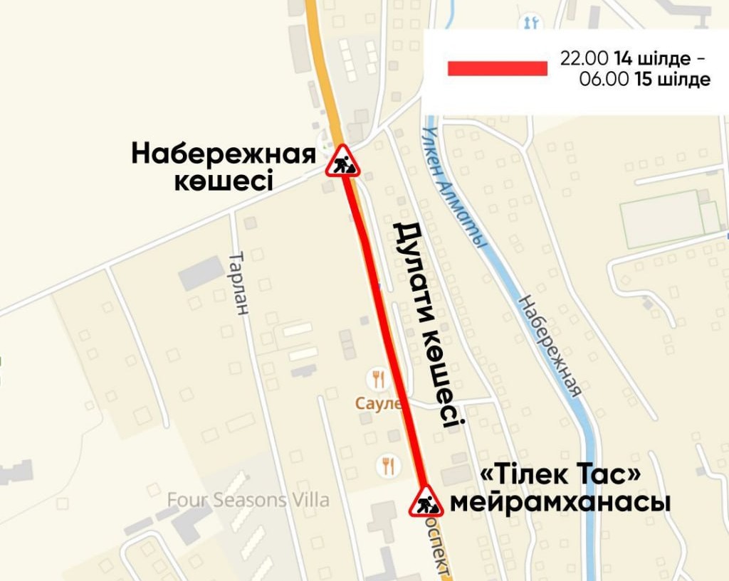Движение закроют для проведения среднего ремонта дороги. С 22.00 14 июля до 6.00 15 июля перекроют отрезок улицы Дулати от ресторанного комплекса "Тілек Тас" до улицы Набережная.