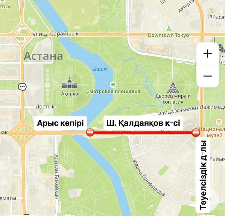 С 8 по 10 октября перекрыт участок по улице Калдаякова от проспекта Тауелсиздик до моста Арыс.