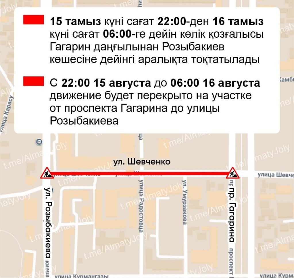 "С 22.00 15 августа до 6.00 16 августа движение будет перекрыто на участке от проспекта Гагарина до улицы Розыбакиева", – говорится в сообщении.
