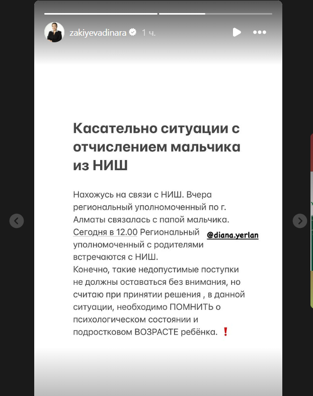 "Сегодня в 12.00 региональный уполномоченный с родителями встречаются с НИШ. Конечно, такие недопустимые поступки не должны оставаться без внимания, но считаю при принятии решения в данной ситуации необходимо помнить о психологическом состоянии и подростковом возрасте ребёнка", – написала Закиева на своей странице-Instagram.
