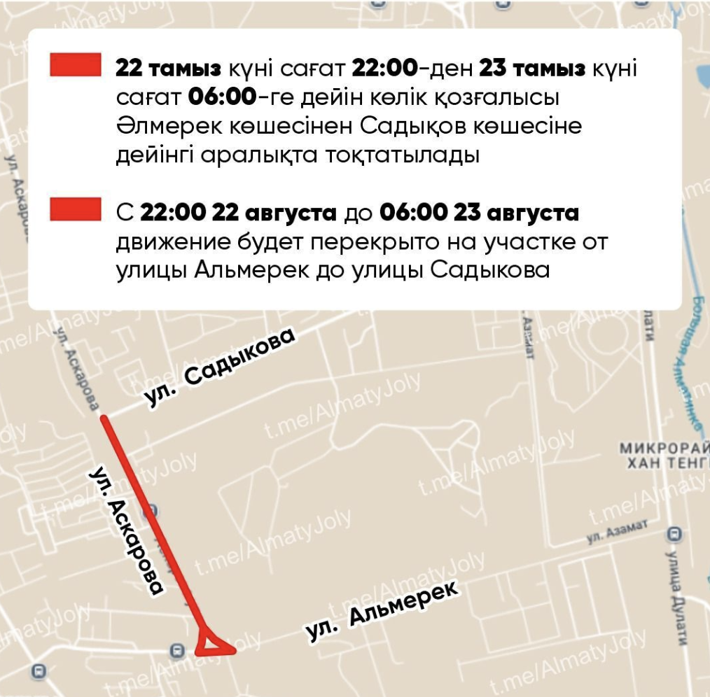 В Алматы частично перекроют улицу Аскарова до утра 23 августа, сообщили в акимате города.