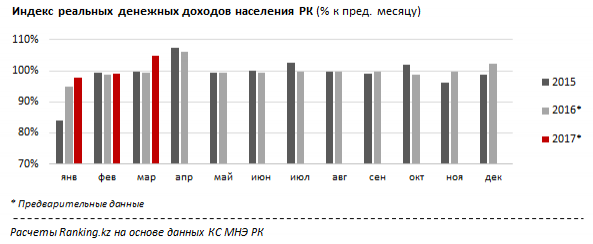 Ситуация с реальными доходами в текущем году значительно лучше, чем это было в прошлом году. В 2016 году покупательная способность зарплат и прочих поступлений в бюджет среднего казахстанца сокращалась со средней скоростью в 0,2% в месяц. За 2016 год реальные доходы в РК впервые за последние 7 лет упали на 4,5%.