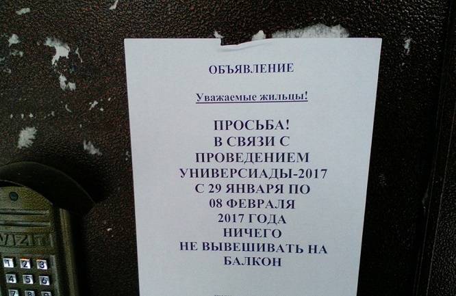 Объявления о том, что алматинцы не должны вывешивать что-либо на балконах с 28 января по 8 февраля, появились на подъездных дверях домов, расположенных по близости от места проведения Универсиады.
