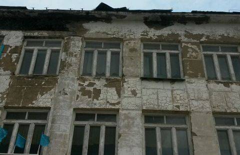 На снимках видны и обшарпанные стены унылого трехэтажного здания (помещение побелено только на уровне первого этажа), и сорванная кровля, и местами разбитые окна.