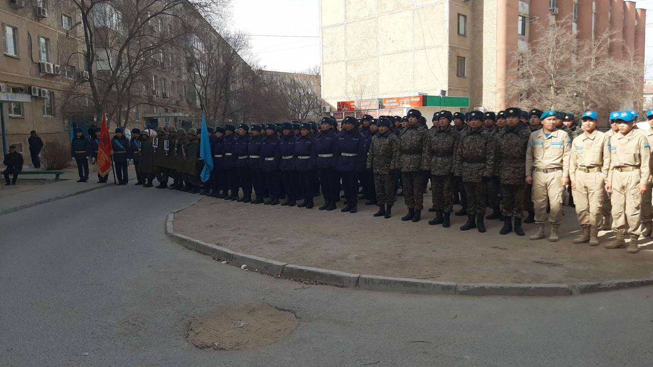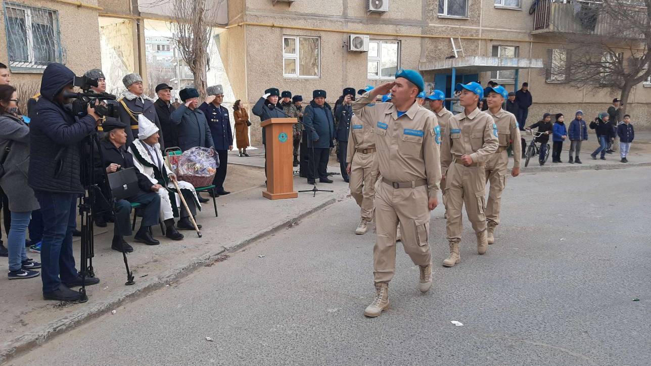 Перед аксакалом во дворе дома, в котором он живёт, парадным строем прошло более 100 военнослужащих воинской части 6656, а также сотрудники полиции и воспитанники "Жас Сарбаз", сопровождаемые военным оркестром.