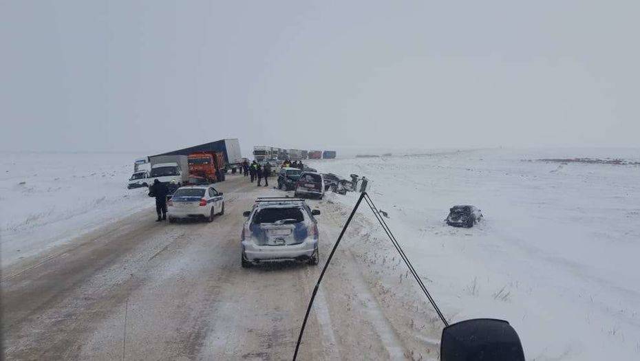 Около 13.45 в Хромтауском районе Актюбинской области на 859-м км столкнулись 11 автомашин – две грузовые, восемь легковых и один микроавтобус.