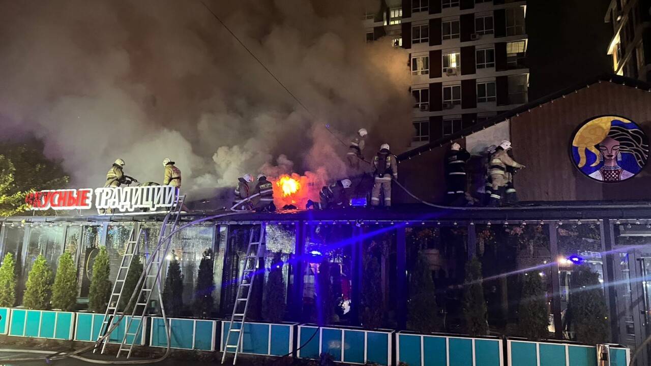 "Пожарные автомобили в количестве пяти автоцистерн и двух автолестниц, незамедлительно направленные к месту пожара, прибыли через пять минут. По прибытию установлено горение кровли ресторана "Modi Restoranchik" и замыкание силовых электрокабелей в местах открытого пламени, что создавало угрозу поражения электрическим током пожарных. В связи с этим в первую очередь тушение проводилось как внутри кафе, так и по его периметру для предотвращения распространения горения, защиты соседних помещений и зданий с соблюдением мер безопасности", – говорится в сообщении.