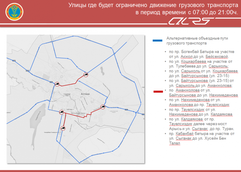 Отмечается, что движение грузового транспорта будет ограничено с 7 часов утра и до 9 часов вечера. Также уточняется, на каких участках будет введено ограничение. В первую очередь оно коснётся проспекта Богенбай Батыра на участке от улицы Акжол до улицы Бейсековой. В качестве альтернативного маршрута предлагается шоссе Алаш и автомобильная дорога "Обход Астана" от проспекта Тлендиева до улицы Бейсековой.
