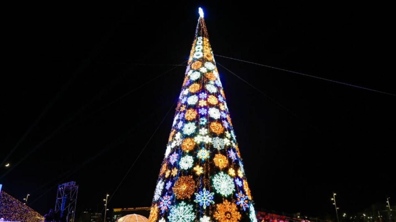 Высота новогодней ёлки Астаны составила 25 метров. Её украсили световыми декоративными узорами, игрушками, стробоскопами, гирляндами, а на вершине расположили снежинку размером 2 метра.
