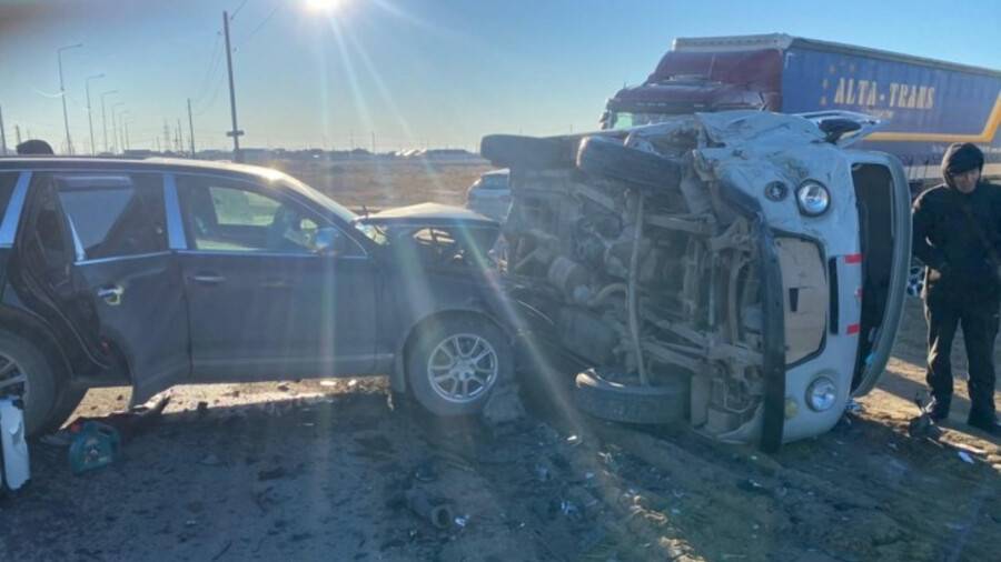 В Атырау машина скорой помощи перевернулась после столкновения с легковым автомобилем на перекрёстке двух улиц, сообщает Аtpress.kz.