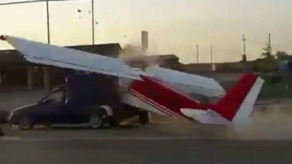 Необычное ДТП попало на видео. Очевидец снял, как по трассе разгоняется самолёт и, не успев подняться в воздух, врезается в припаркованный автомобиль. Мужчина, находящийся возле машины, отлетел и упал на землю.