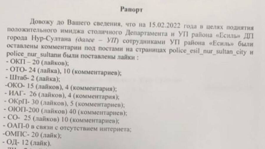 В соцсетях появился рапорт полицейских района Есиль о том, сколько комментариев они оставили и сколько поставили лайков.