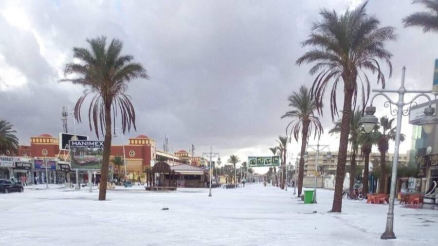 На красноморский египетский курорт Хургаду в субботу обрушился град, а зелёные газоны и пальмы оказались покрыты снегом, сообщает Al Youm As Sabi.
