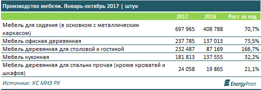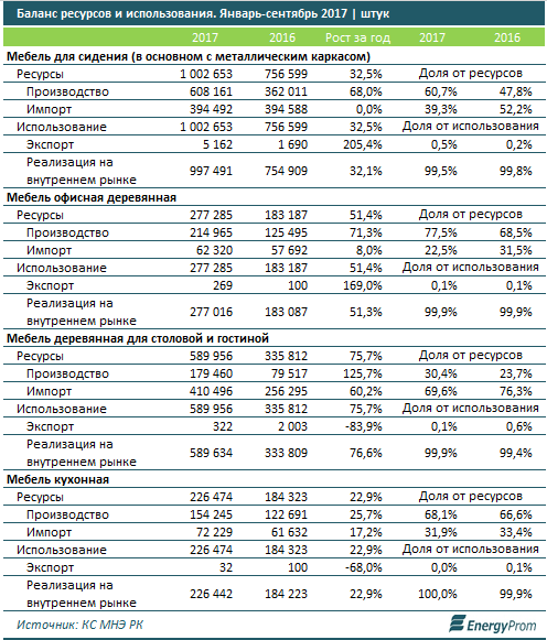 По итогам трёх кварталов, согласно официальным данным, казахстанские производители обеспечивают 60,7% спроса на стулья и табуретки, 77,5% рынка деревянной офисной мебели, 30,4% – мебели для столовых и гостиных и 68,1% – кухонной мебели.