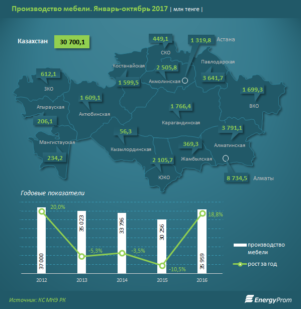 По итогам десяти месяцев мебельщики произвели продукции сразу на 49% больше, чем в аналогичном периоде годом ранее. Не скупятся на покупку новой мебели жители Алматы, Алматинской и Павлодарской областей.
