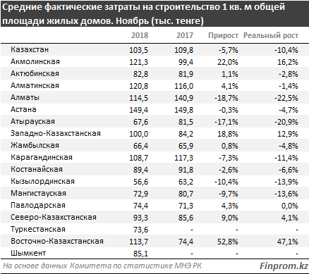 Фактические затраты казахстанских застройщиков на ввод в эксплуатацию квадратного метра жилья заметно сократились. По итогам ноября показатель составлял всего 103,5 тысячи тенге – на 5,7% меньше, чем годом ранее, сообщает Finprom.