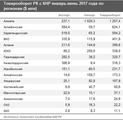 Наиболее крупными экспортёрами являются Актюбинская, Карагандинcкая области и ВКО, занимающиеся поставкой меди, радиоактивных элементов, ферросплавов и прочих материалов, что составляет 51% всего экспорта в Китай.