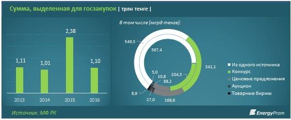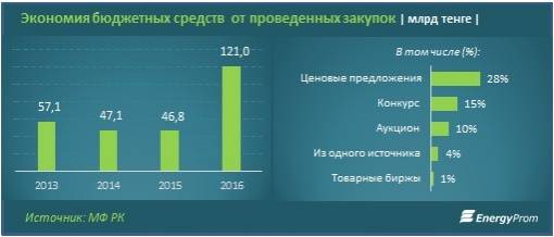 За 2016 год на госзакупки из бюджета выделено 1,1 трлн тенге. Экономия от проведённых процедур составила 11% или 121 млрд тенге, увеличившись за год более чем в 2,5 раза, сообщает EnergyProm.