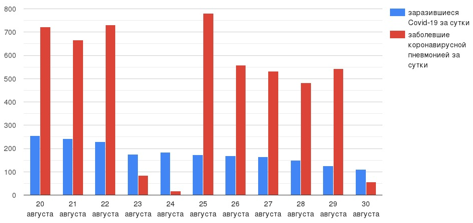 За сутки выздоровели 26 пациентов, ранее заболевших коронавирусной пневмонией. Всего с 1 августа зарегистрировано 5 575 человек, переболевших пневмонией с признаками Covid-19.