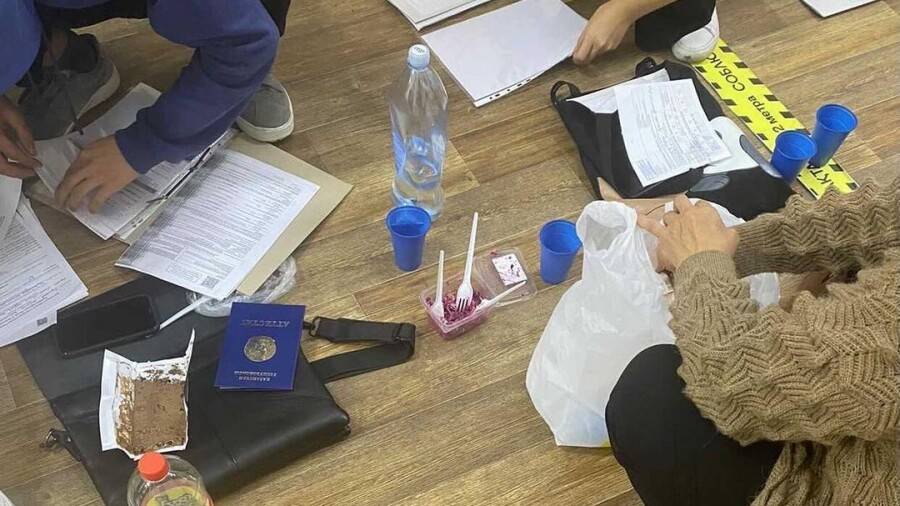 На фотографиях, распространённых в соцсетях, будущие студенты и их родители сидят на корточках и едят на полу, по всей видимости, из-за отсутствия необходимого количества скамеек.