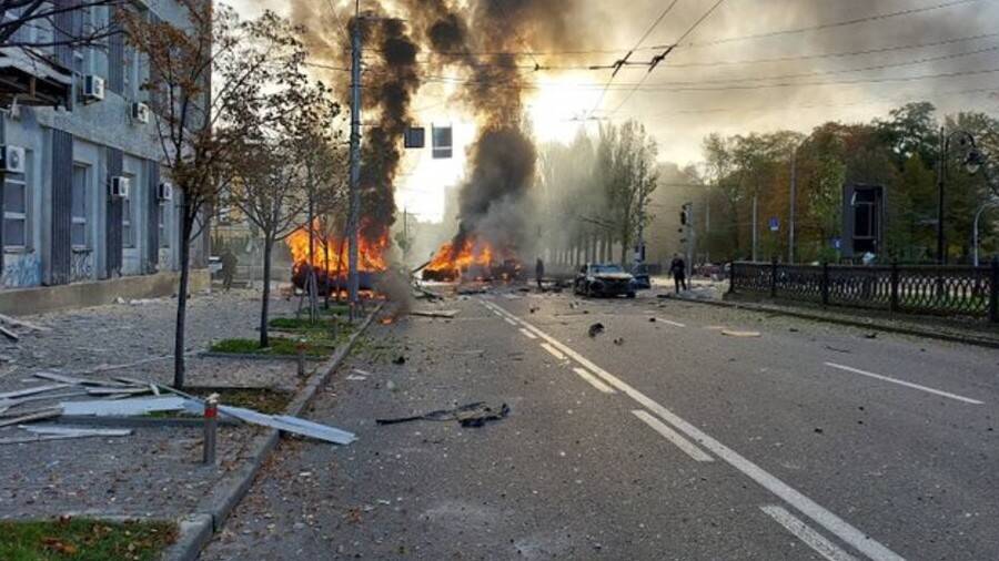 Cоветник главы МВД Антон Геращенко сообщил, что одна из ракет в Киеве упала в районе памятника Грушевскому на улице Владимирской. На этой улице находится здание Службы безопасности Украины, неподалеку расположен офис президента Украины. Также Геращенко утверждает, что ракетоноситель упал на детскую площадку. В метро Киева движение поездов по "красной" линии приостановлено, все подземные станции работают как укрытия.