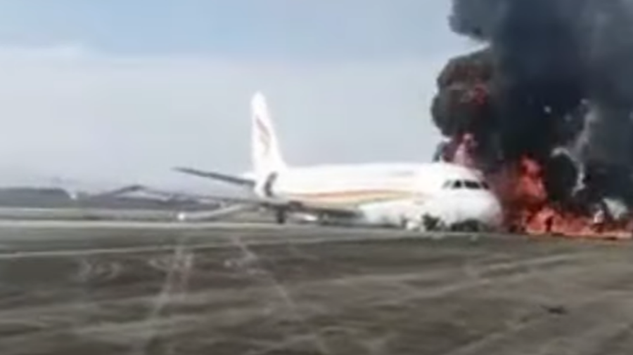 В соцсетях распространяется видео с самолётом Tibet Airlines. Со стороны левого борта самолёта видны густой дым и пламя.