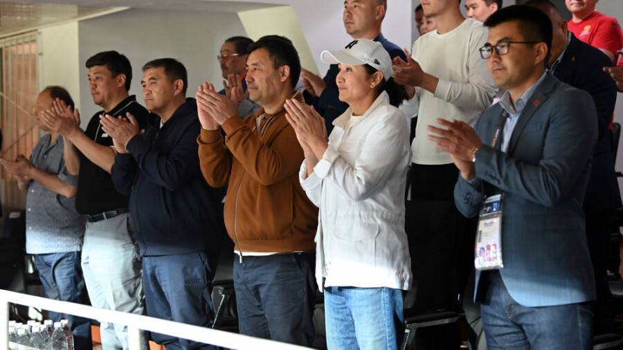 Кроме президента, на матч пришли мэр Бишкека Эмилбек Абдыкадыров, зампред кабмина Бакыт Торобаев, глава ГКНБ Камчыбек Ташиев и первая леди Айгуль Жапарова.