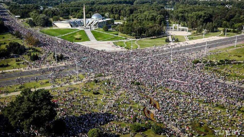 Десятки тысяч протестующих собрались у стелы "Минск – город-герой" затем пошли ко Дворцу независимости – резиденции Лукашенко.