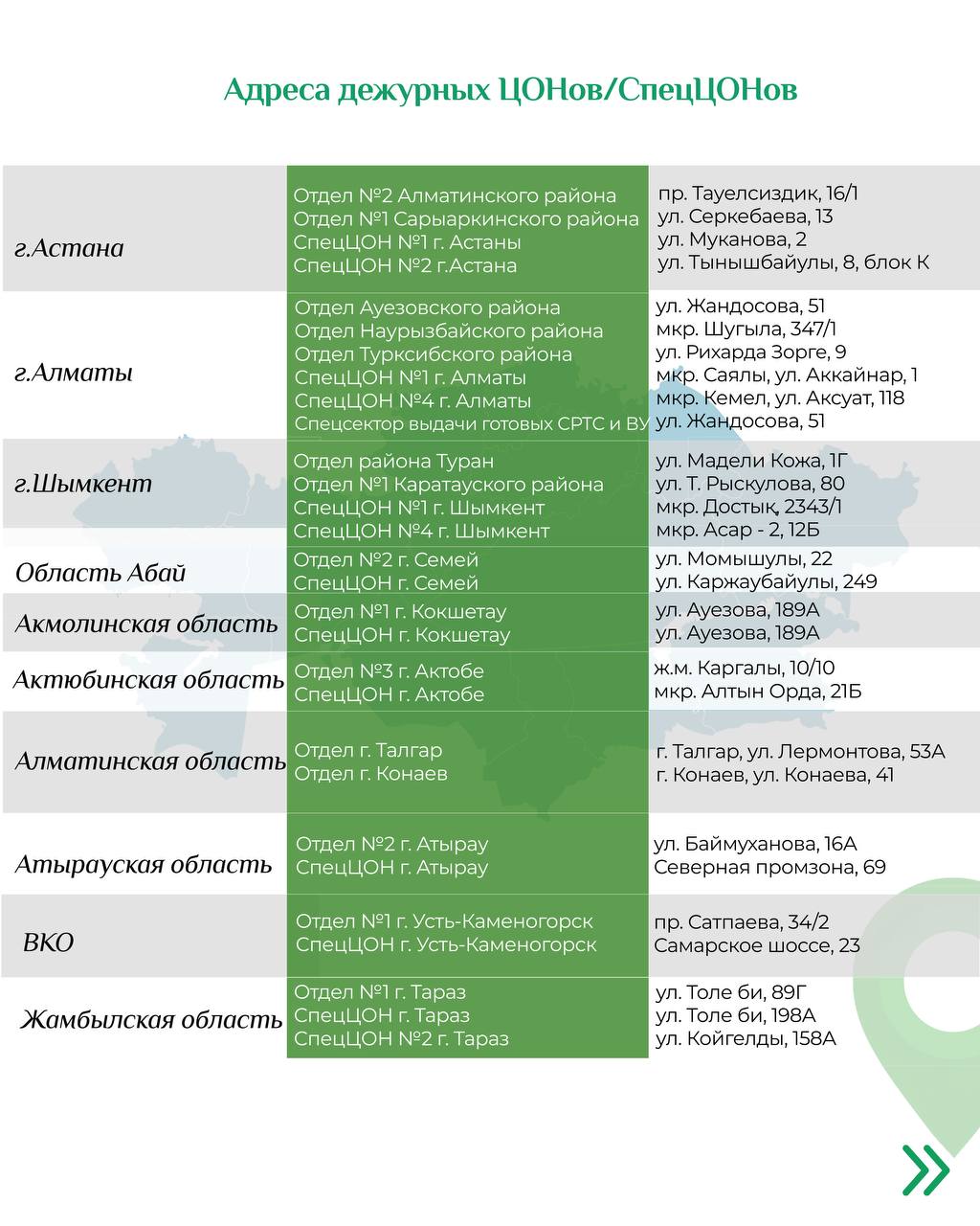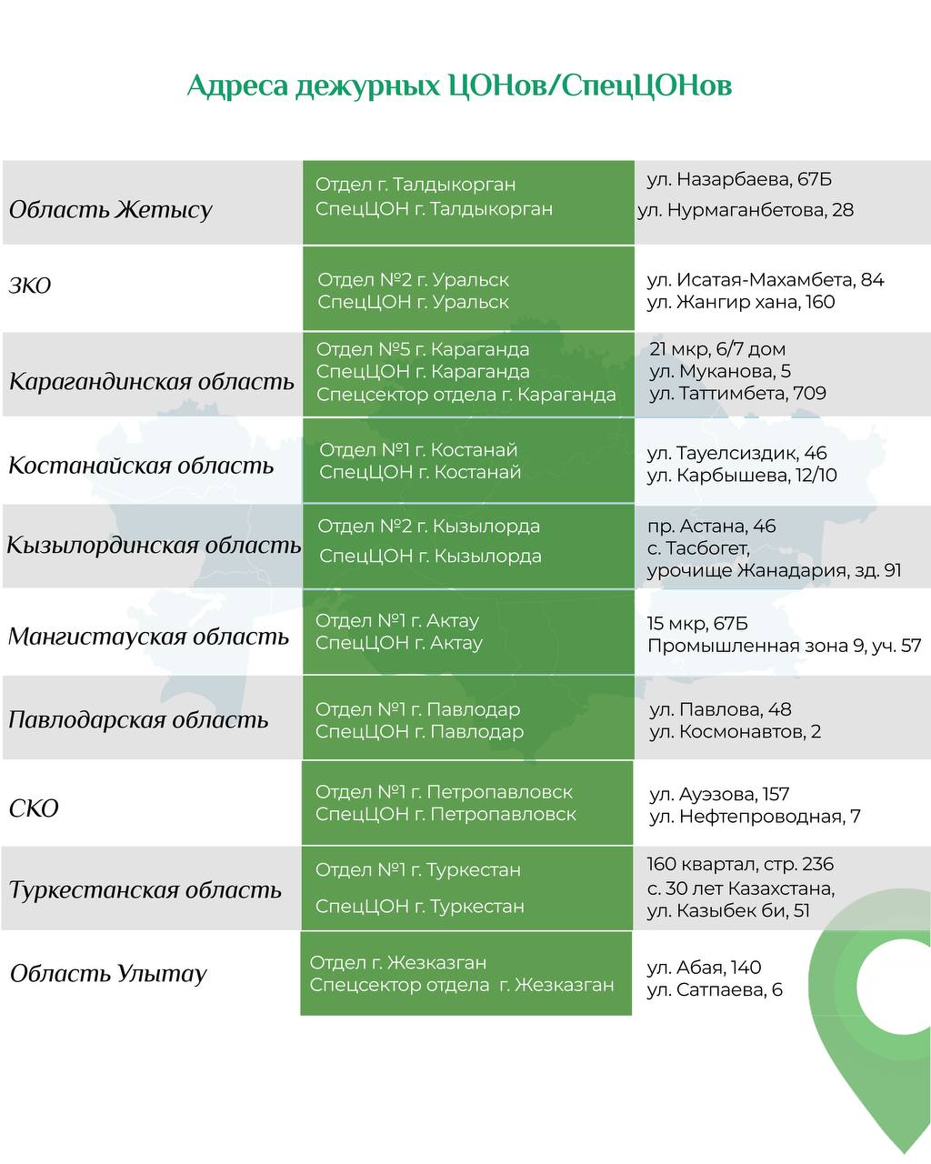 С 1 июля в Шымкенте, Усть-Каменогорске, Таразе, Уральске, Караганде, Туркестане, а также в Улытауской области обновили местоположение дежурных ЦОНов.