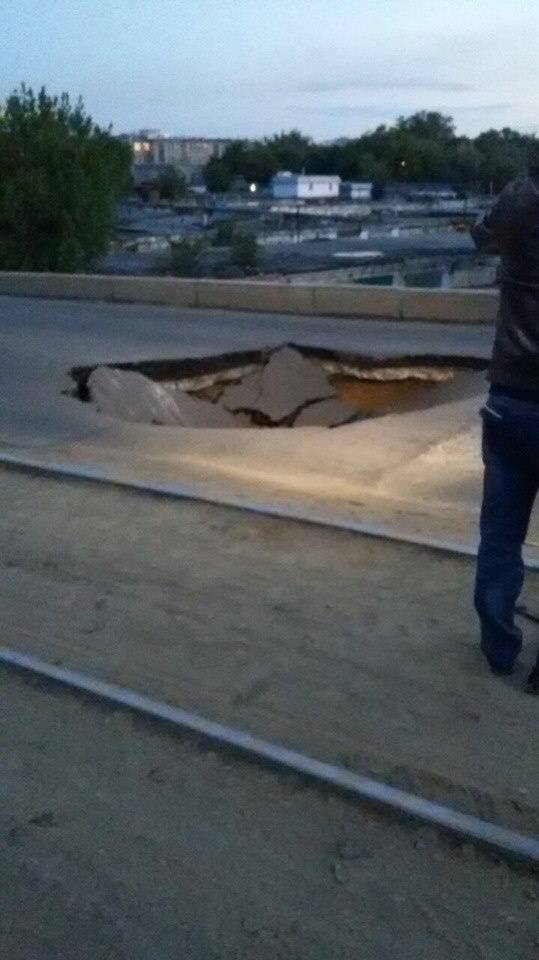 Провал дорожного полотна на мосту в опасной близости от трамвайных путей произошёл вечером 12 мая.