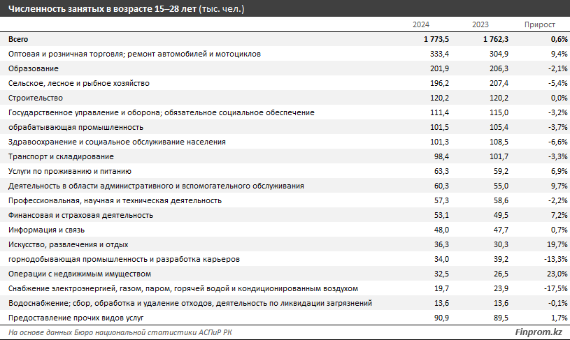 Большинство занятых молодых казахстанцев осуществляли деятельность в сферах торговли, авторемонта, образования и сельского хозяйства. Официальными безработными были 62 тысячи казахстанцев этого возраста, что на 6,7% меньше, чем в 2023 году.