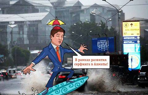 Аким использует непогоду в благих целях, лихо рассекая волны по проспекту Аль-Фараби на сёрфборде, популяризируя личным примером новый для города вид спорта.