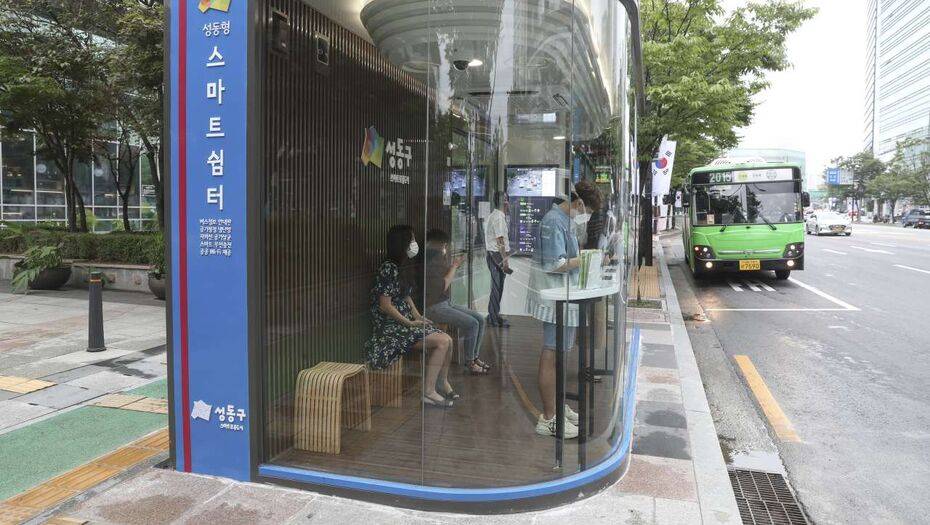 В столице Южной Кореи установили умную остановку Smart Shelter для борьбы с летней жарой, сезонным дождём и коронавирусом, сообщает Reuters.