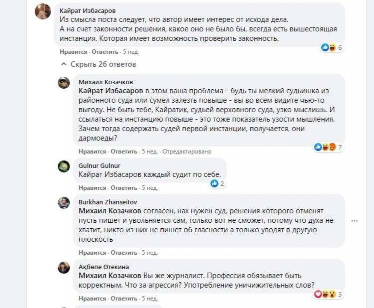 Комиссия судебной этики не стала наказывать судью Энбекшинского районного суда Шымкента Кайрата Избасарова за комментарии под публикацией в социальной сети Facebook.