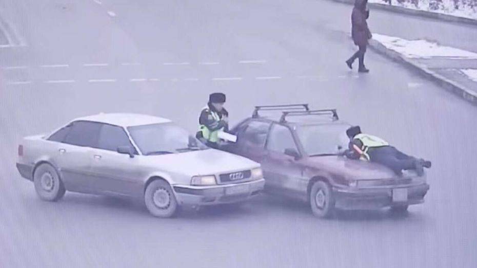 В Шымкенте водитель, пытаясь скрыться с места ДТП, сбил перегородившего ему дорогу полицейского и протащил его на капоте, сообщает Polisia.kz.