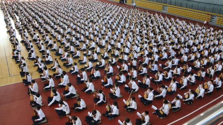 Школьники исполнили знаменитые кюи "Сарыарка", "Балбырауын", "Еркем-ай", "Кенес", "Жастар биы", а также рассказали историю их создания. Событие планируют внести в Книгу рекордов Гиннесса как самый масштабный урок игры на домбре.
