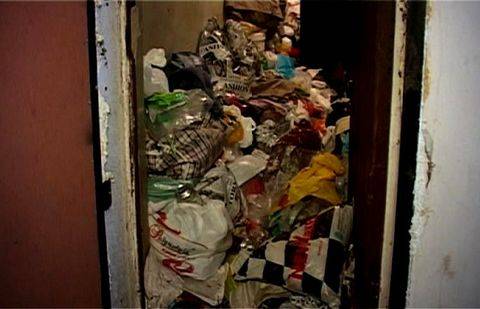 Вера Кравчук тащит мусор домой с помойки. Как выходит женщина из квартиры - не понятно, ведь пакетами и бутылками квартира забита по самую дверь.