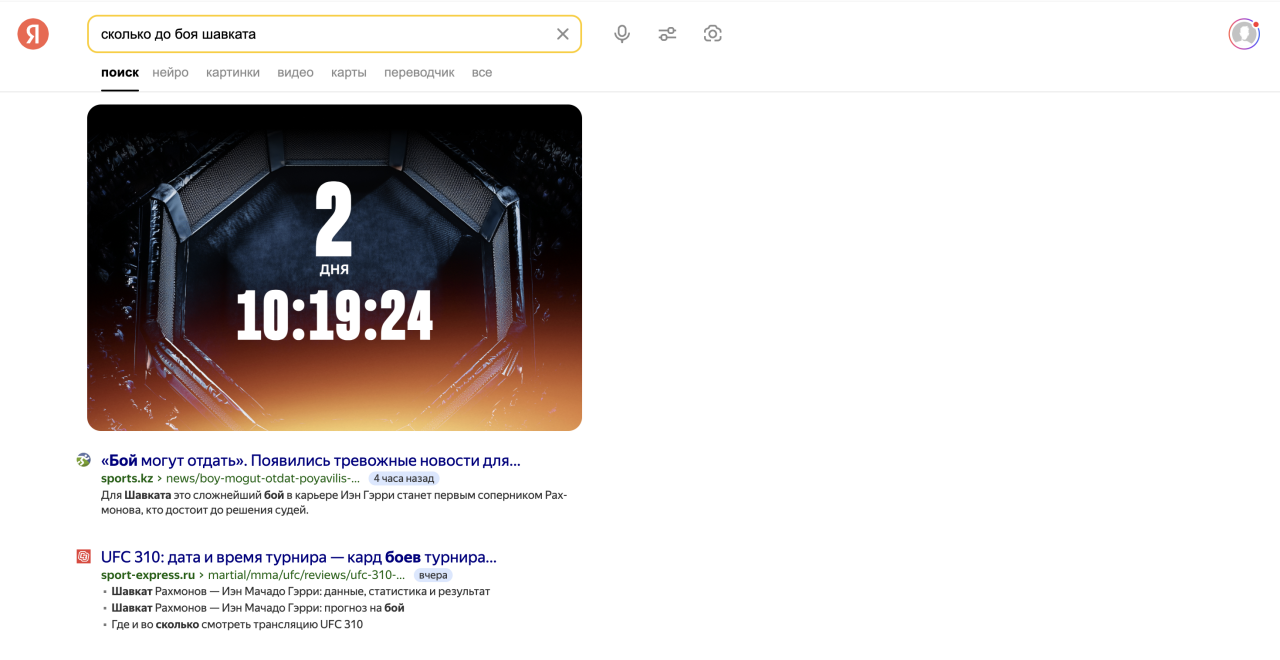 Если в Яндекс Поиске в Казахстане задать вопросы о предстоящем бое, например, "сколько до боя Рахмонова" или "когда бой Шавката Рахмонова", то появится изображение октагона UFC с обратным отсчётом, сколько времени осталось до важного события.