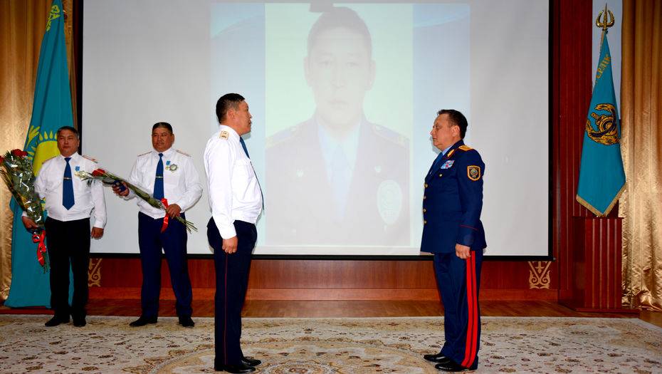 6 мая в ДВД Жамбылской области за проявленное мужество в задержании преступников, совершивших особо опасное преступление, наградили троих полицейских.