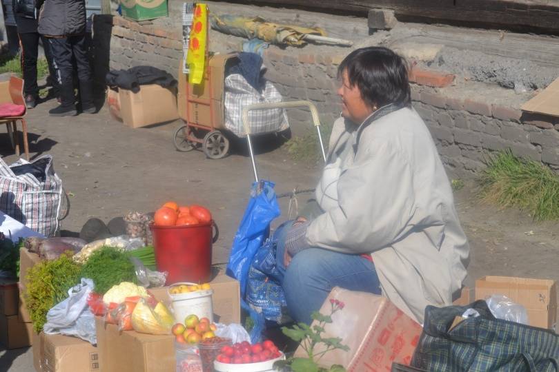 Надежда Николаевна каждый день стоит возле магазина "Океан", где разрешено торговать. А сегодня пришла к оптовому рынку, так как места на прежней точке не хватило.
