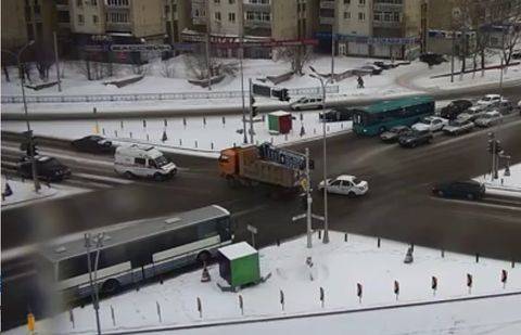 В интернете была опубликована видеозапись, сделанная камерой уличного наблюдения в Караганде. Водитель КамАЗа так разогнал большегруз, что не смог остановить машину на перекрёстке. Многотонная махина вылетела на красный свет на дорогу, по которой в этот момент двигался встречный транспорт.