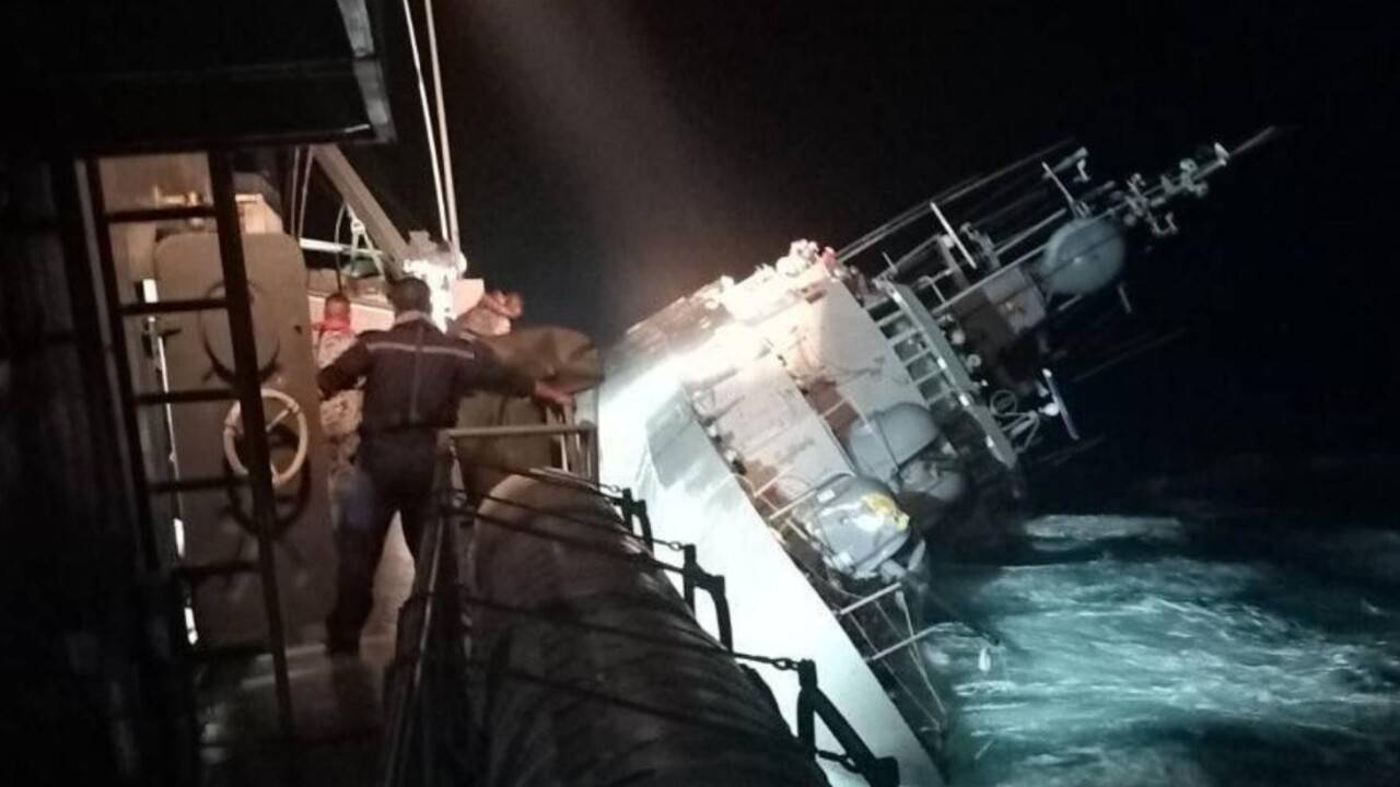 На кадрах, размещённых ВМС Таиланда, видно, что судно накренилось на правый борт, а спасатели тем временем проводят поисковые работы.