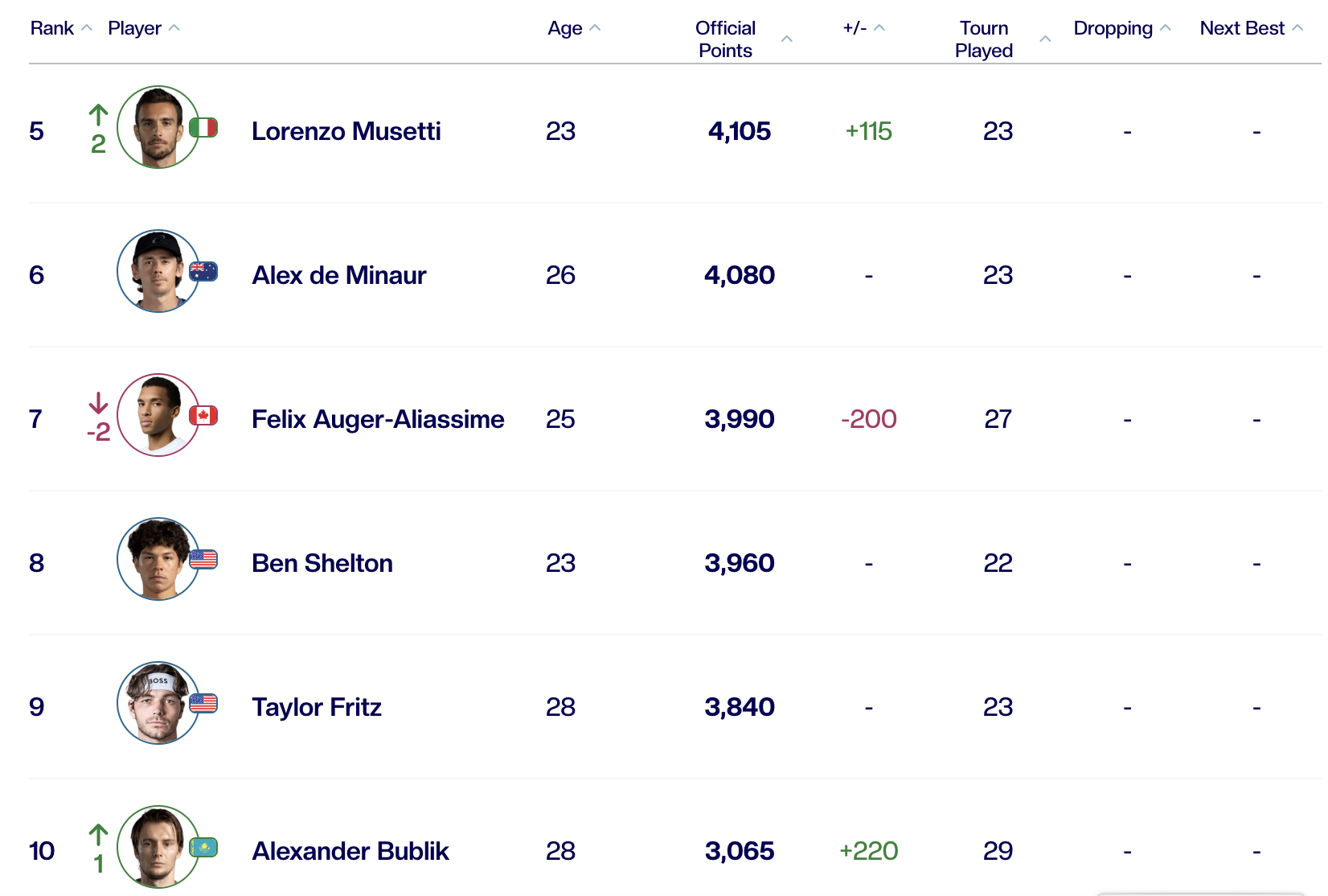 Рейтинг возглавляет теннисист из Испании Карлос Алькарас, на втором месте – итальянец Янник Синнер, замыкает тройку лидеров Александр Зверев из Германии.