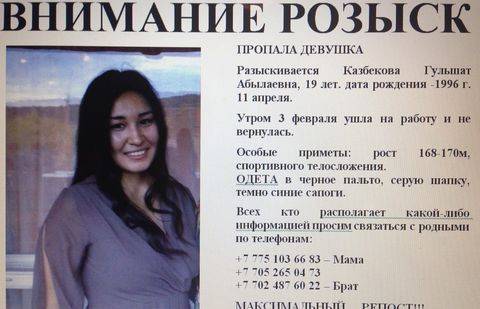 "Гульшат 19 лет, она учится заочно в Кокшетау. В Астане работает кассиром на автозаправке в пригородном посёлке Косшы. Когда она исчезла, с неизвестного номера пришло сообщение якобы от Гульшат на телефон её мамы о том, что она будет на похоронах у подруги и приедет на следующий день. Домой она так и не вернулась. К слову, ни о какой подруге, у которой были недавно похороны, мы не в курсе. И телефон Гульшат, и телефон, с которого пришло SMS, отключены", - поделился брат Гульшат Даурен Казбеков.
