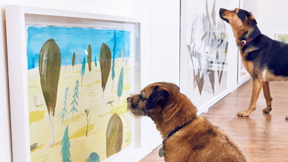 Выставка состоит из нескольких частей. Одна из них – картинная галерея. Все картины нарисованы в цветовом спектре, который доступен собачьему глазу. На них изображены куриные ножки, леса, письмо, проваливающееся в почтовый ящик, и бегущие по парку собаки.