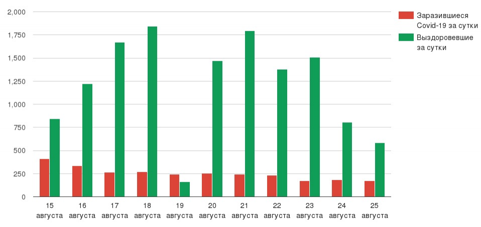 Всего коронавирусом в стране заразились 105 075 человек (лабораторно подтверждённые случаи). По данным на 25 августа, скончалось 1534 человека (статистику по смертности в разрезе регионов Минздрав предоставляет раз в неделю, она представлена в таблице).