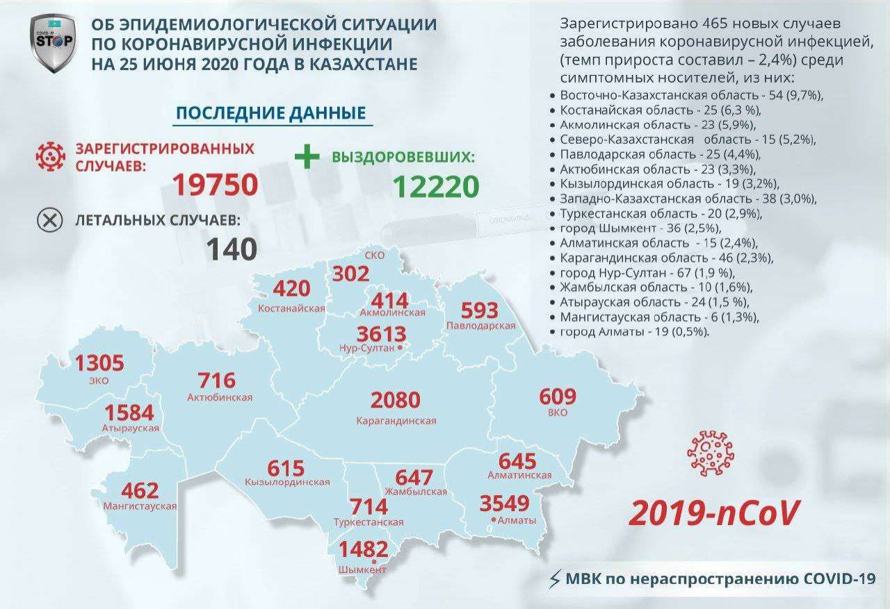 В Казахстане за прошедшие сутки зарегистрировали 465 случаев заражения коронавирусной инфекцией с проявлением симптомов (прирост за сутки + 2,4%).