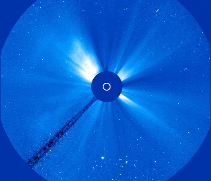 "Для тех, кто не привык к космическим снимкам, ниже небольшие пояснения. Телескоп снимает Солнце, находясь примерно около Земли, то есть видит плазму, которая летит на него. Плазменное облако в полете расширяется и увеличивается в размерах, что создаёт оптическую иллюзию, как будто плазма летит не "прямо в объектив", а в стороны вокруг Солнца. Для осознания масштабов: Солнце – белый (не синий) кружок в центре", – пояснили в лаборатории.
