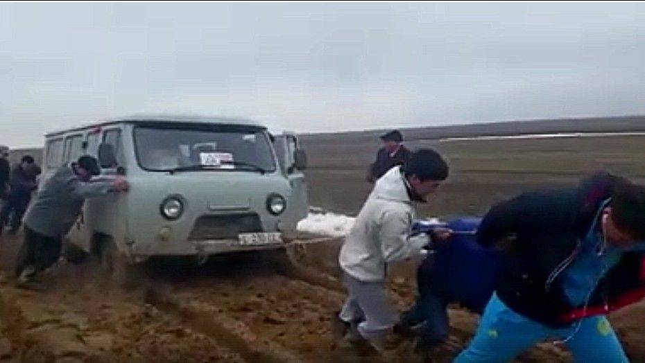 "Прислали видео по ватсапу, – пишет Екрин Карин. – Казахи вытаскивают УАЗ из грязи. Мы будем похлеще, чем бурлаки, которые тащат корабль по воде".